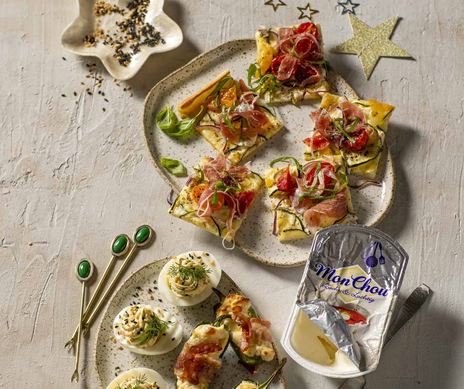 Ben je op zoek naar het ultieme borrelhapje voor op de borrelplank? Maak dan eens deze heerlijke flammkuchen met MonChou, courgette en parmaham. Snijd de flammkuchen vervolgens in kleine stukjes en je hebt een heerlijk borrelhapje. Zet jij de wijn alvast koud?