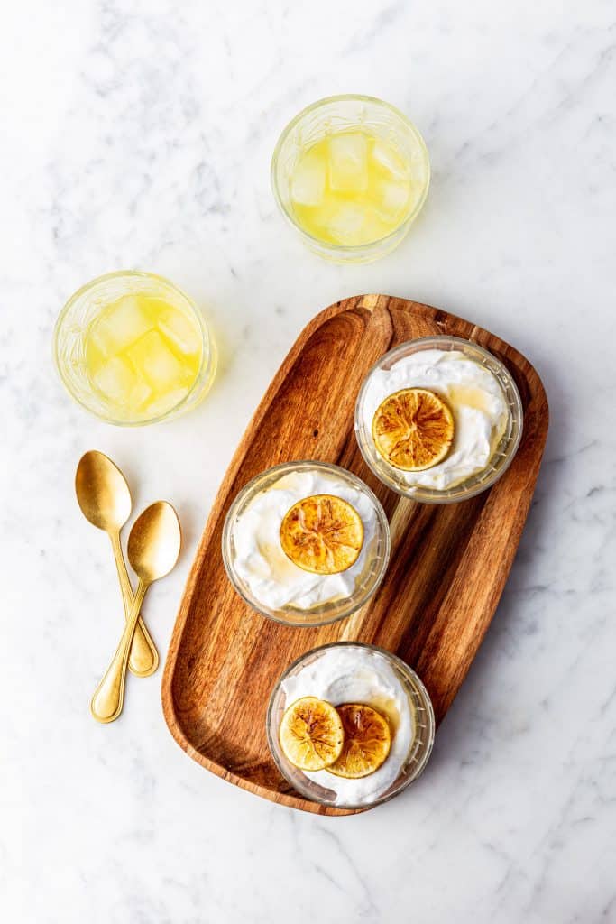 Garneer de limoncello mousse met de limoenschijfjes en serveer!