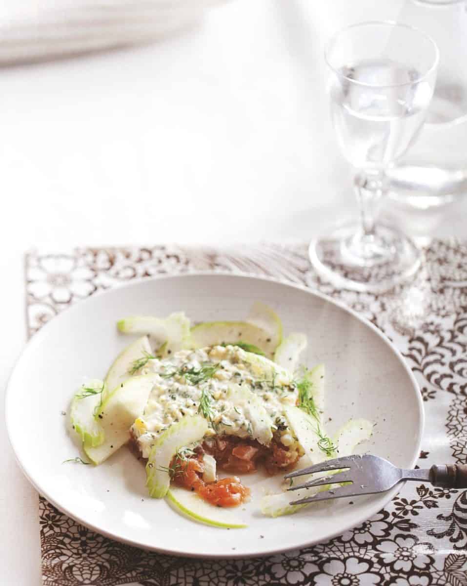 > naar het recept voor zalmtartaar met appel, dille en selderij