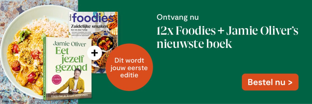 En als kers op de taart komt Jamie binnenkort met een nieuw boek: ‘Eet jezelf gezond’ – ja, ook hier staan heerlijke desserts in! En laten wij hier nu een onwijs toffe actie voor hebben.: neem nu een jaarabonnement op Foodies en ontvang 12x het magazine en zijn nieuwste boek samen voor maar € 65!