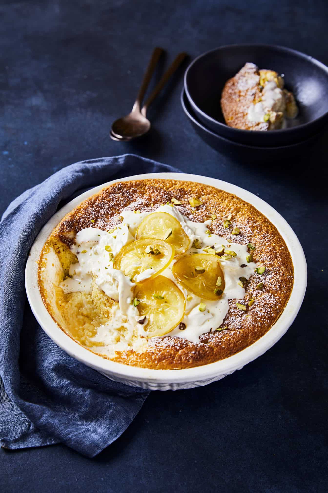 Vet een ronde bakvorm in met boter en schenk het beslag erin. Zet de vorm in een diepe ovenschaal en vul de schaal met kokend water totdat de bakvorm voor de helft onderwater staat. Bak het geheel 40-50 minuten in de oven tot de bovenkant goudbruin is. Controleer de cake na ca. 40 minuten, zodat hij niet te ver doorgaart. Haal de cake uit de oven en laat ca. 10 minuten afkoelen. De cake blijft een beetje klef – dat hoort zo.