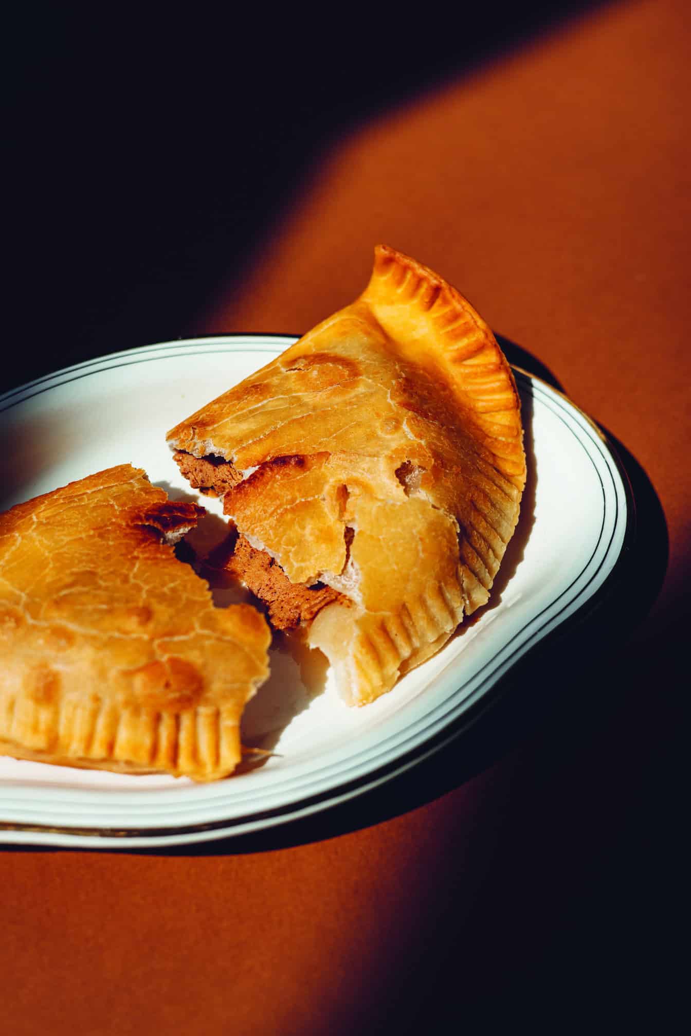 Maak eerst 4 tot 8 balletjes van het deeg en rol ze dan plat met de deegroller tot een doorsnee van ongeveer 8 centimeter. Schep 1 theelepel pindakaas, eventueel wat sambal en pinda’s in het midden van elke deegcirkel en smeer alles uit. Laat de randen wel vrij, smeer die in met een beetje water en vouw de empanada’s dicht tot halvemanen. Druk met een natte vork de randen wat steviger op elkaar, ziet er nog leuk uit ook.