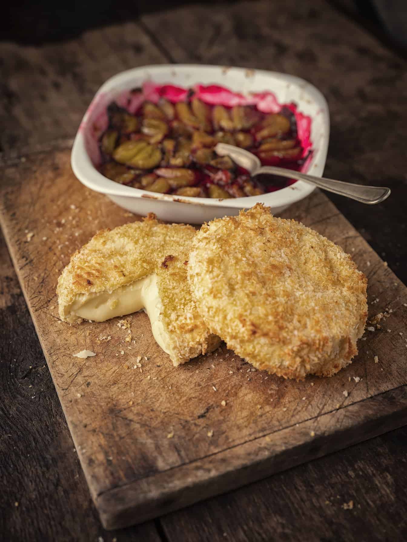 Serveer de pruimen en gepaneerde camembert lauwwarm.