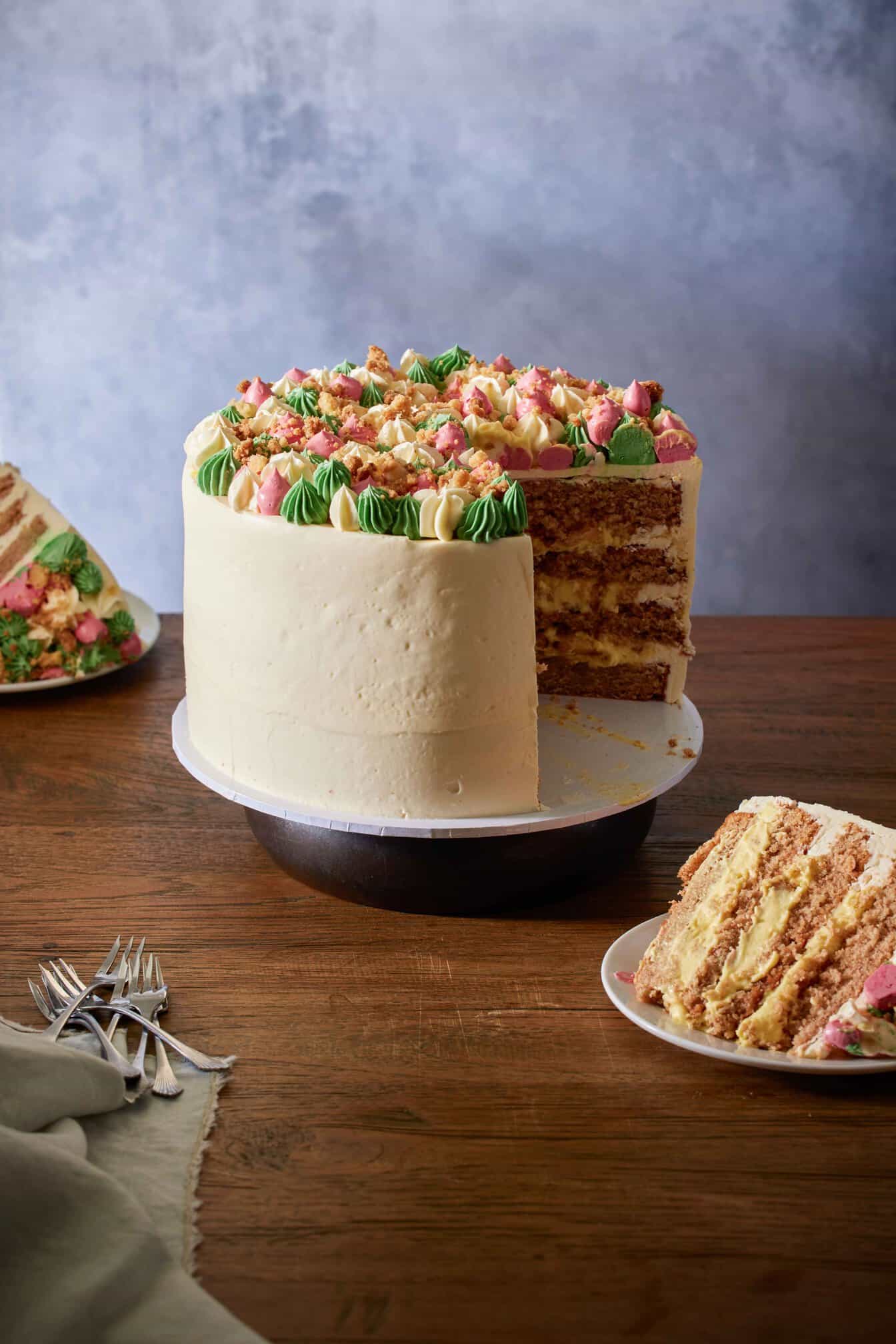 Kaneelcake met saffraanroom, crumble, botercrème en gekleurde botercrèmetopping