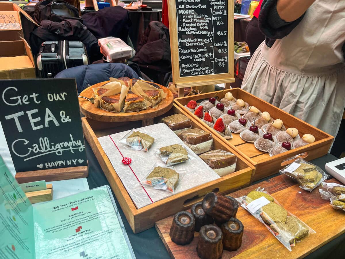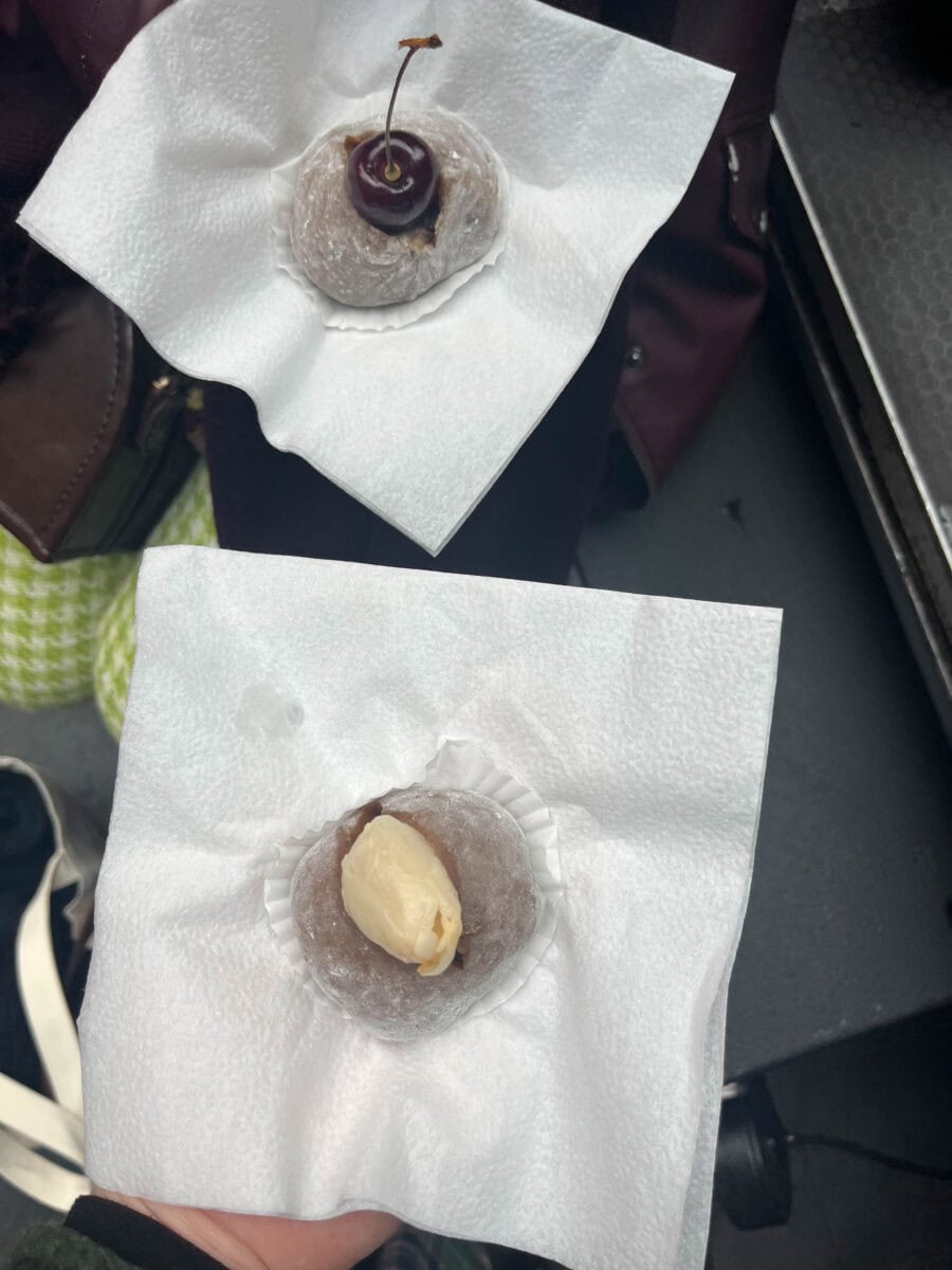 Omdat ik van al die thee toch wel honger heb gekregen, besluit ik als laatste twee daifuku mochi te kopen bij een Japans kraampje. Dat is een soort cakeje gemaakt van kleefrijst met een zoete vulling, in dit geval van een romige custard met daarin thee verwerkt.