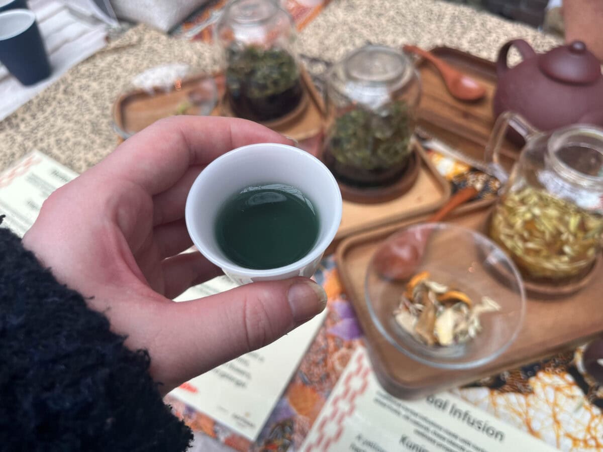 Bij een kraam waar Koreaanse thee wordt verkocht, krijg ik een lesje in theeteelt. “Bij het woord ‘terroir’ denken we vaak aan wijn, maar voor thee is het net zo belangrijk”, legt de verkoopster uit. “Zo wordt deze groene thee verbouwd het vulkanische eiland Jeju en dat proef je terug.” Ik neem een slokje en snap meteen wat ze bedoelt: de thee is bijna rokerig van smaak en heeft een heel licht zoutige nasmaak, iets dat ik nooit eerder heb geproefd in thee. De thee heeft een heldere, geelgroene kleur en doet me sterk denken aan matcha.