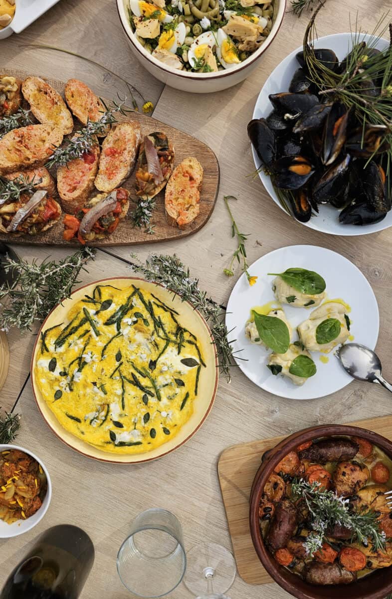 Niet veel later neem ik plaats aan de grote tafel, Anna heeft ondertussen een aantal wijnen van Mas Geli klaargezet. De tafel staat vol met de mooiste gerechten, het merendeel van het eten is typisch Catalaans legt Iolande uit.