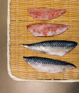 Hij pakt een bamboe dienblad erbij waarop vier moten schoongemaakte vis liggen. Hij wijst ernaar en vertelt: “Dit zijn rode mul en makreel, twee vissoorten die heel geschikt zijn voor dit gerecht omdat ze een stevige textuur hebben. Dat is wel nodig want we gaan de vis pekelen en inleggen.” Ik vraag hem of je ook andere vissoorten voor het gerecht kan gebruiken en Kit antwoordt: “Natuurlijk, kies vooral wat jij lekker vindt. Maar let er wel op dat de vis de juist ferme textuur heeft. Met een tilapia uit het vriesvak van de supermarkt werkt het bijvoorbeeld niet omdat de textuur van de vis door het vriezen te vochtig en zacht is. “Hij pakt er een klein bakje bij en strooit de inhoud over de vismoten. Ik kijk aandachtig wat hij doet en Kit kijkt ons lachend aan “Dit is gewoon keukenzout hoor, niks speciaals. De smaakmakers komen later. Het zouten zorgt er simpelweg voor dat de vis uitdroogt. Dat heeft even de tijd nodig, over een kwartier kunnen we verder.”