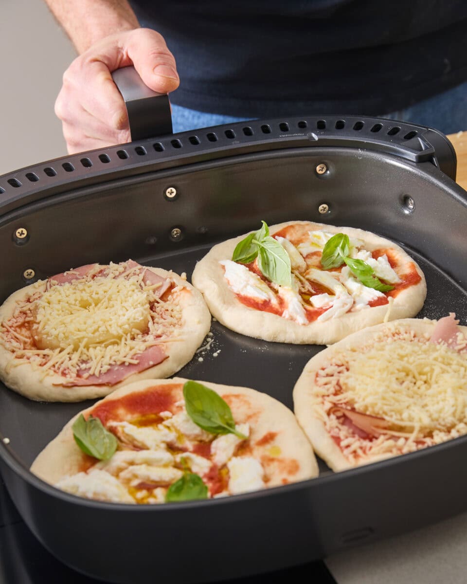 Je kunt 4 van deze pizza’s tegelijk bakken in de Typhur airfryer. Verdeel wat van de tomatensaus over het deeg. Leg op 2 pizza’s een plakje ham, een schijf ananas en geraspte kaas. Maak de andere 2 af met mozzarella, basilicum en olijfolie.